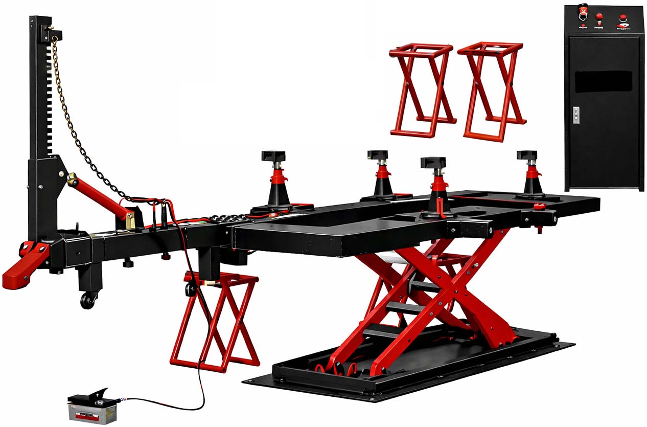 A platform frame bench is a powerful solution for complex repairs of severely damaged vehicles. A reinforced platform and multi-directional pulling systems allow restoration of geometry after significant deformations.